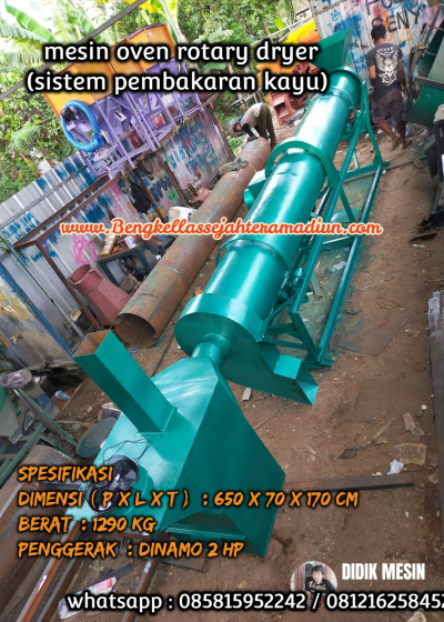 Beranda » Alat Perlengkapan Usaha » Mesin Oven Rotary Dryer Panjang 5.5 Komplit Dinamo 2 Hp Dengan Sistem Pembakaran Kayu