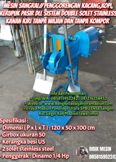 Beranda » Alat Perlengkapan Usaha » Mesin Sangrai//Penggorengan Kacang,Kopi,Kerupuk Pasir dll Sistem Double Solet Stainless Kanan Kiri Tanpa Wajan dan Tanpa Kompor