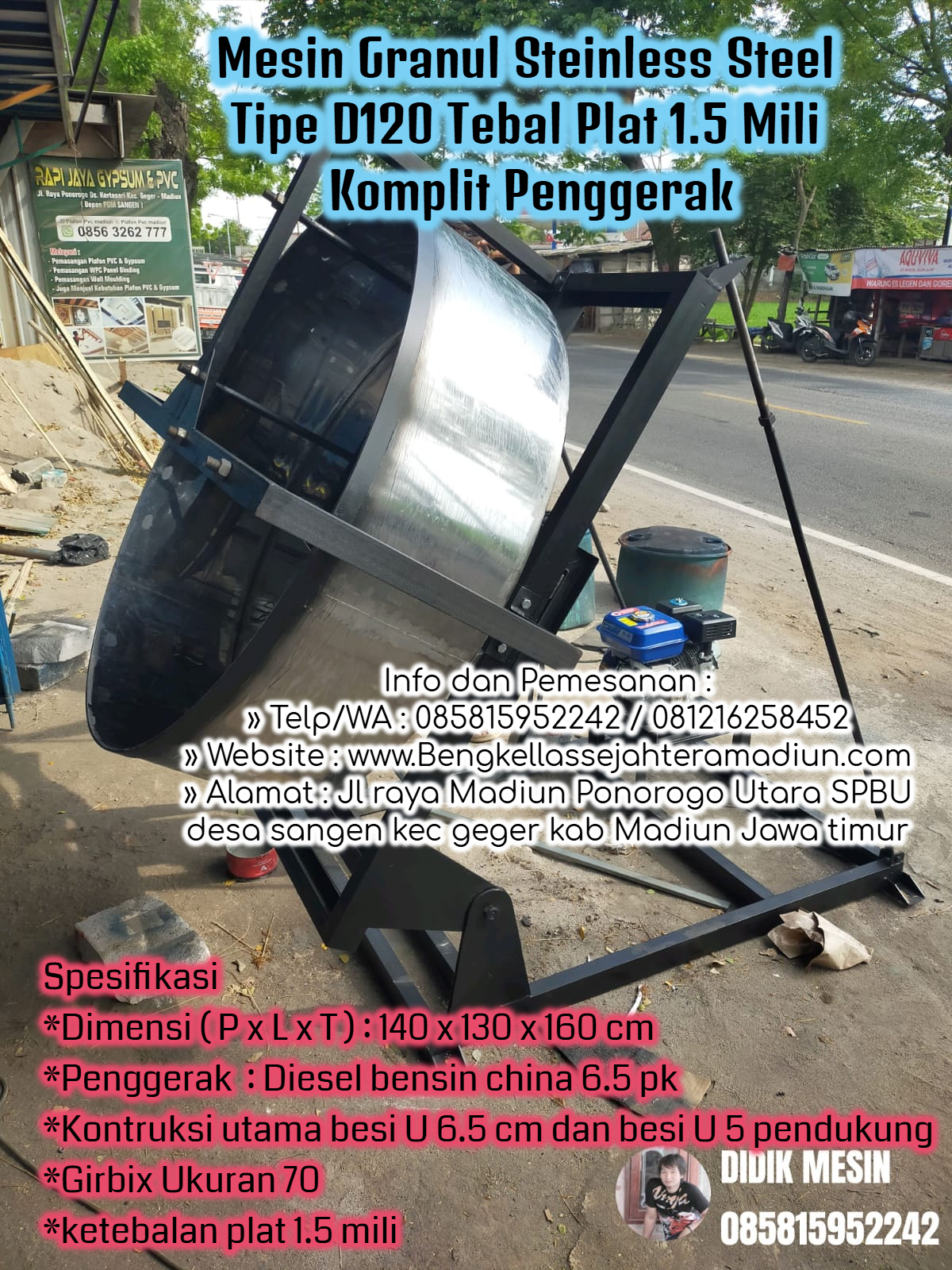 Mesin Granulator tipe D100 Stainless Steel Food Grade Komplit Diesel Honda GP 160 (Tebal Plat 1.5 Mili)